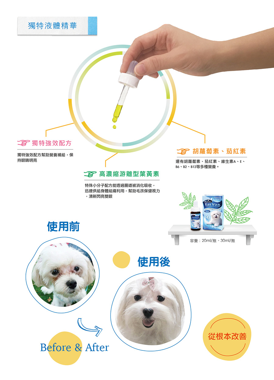 特殊小分子配方能透過嘗到被消化吸收, 迅速提供給身體組織利用,幫助毛孩保健視力 清新閃亮雙眼。
