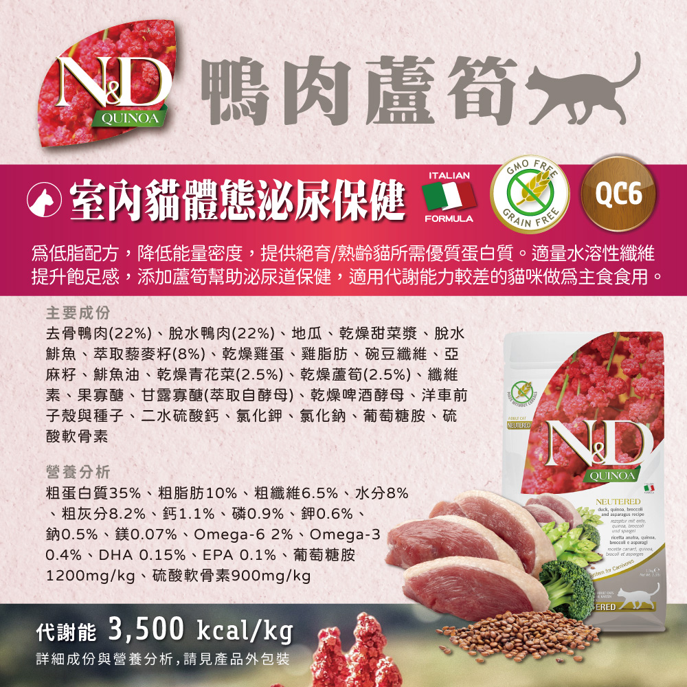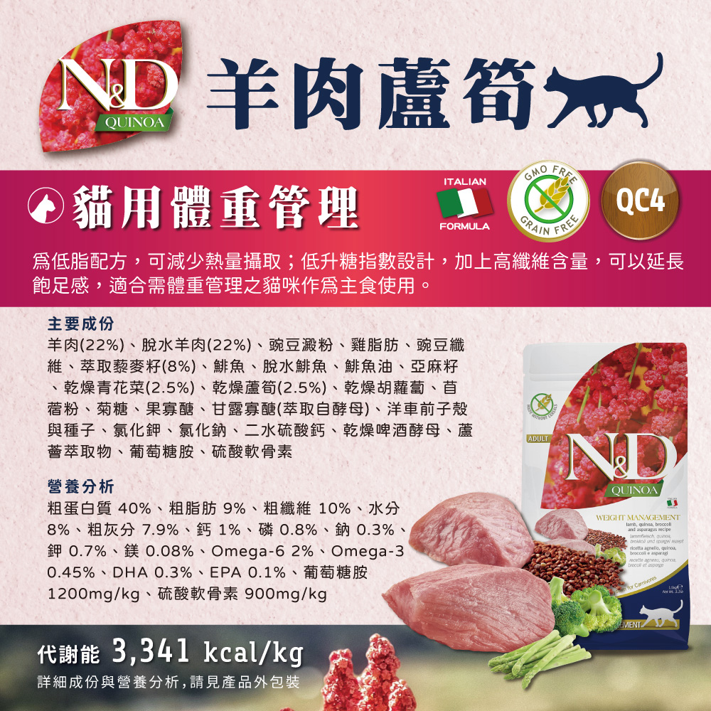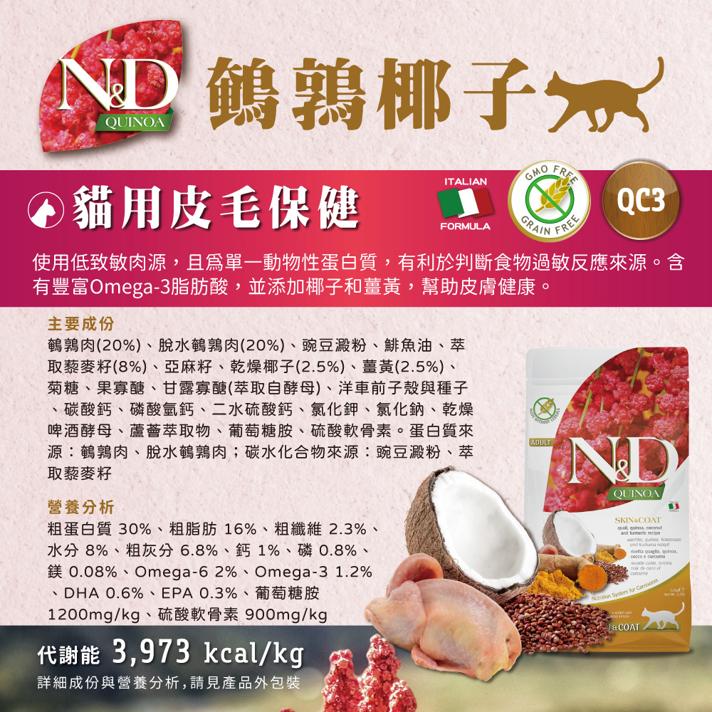 N&D天然藜麥無穀機能系列是針對有特殊營養需求的犬貓設計,一個全新的保健系列食品。本系列不含穀物,以特殊且超過90%的動物性蛋白質來源製成,搭配豐含珍貴營養特性的「超級食物」-藜麥,可以完美支持毛孩的健康。